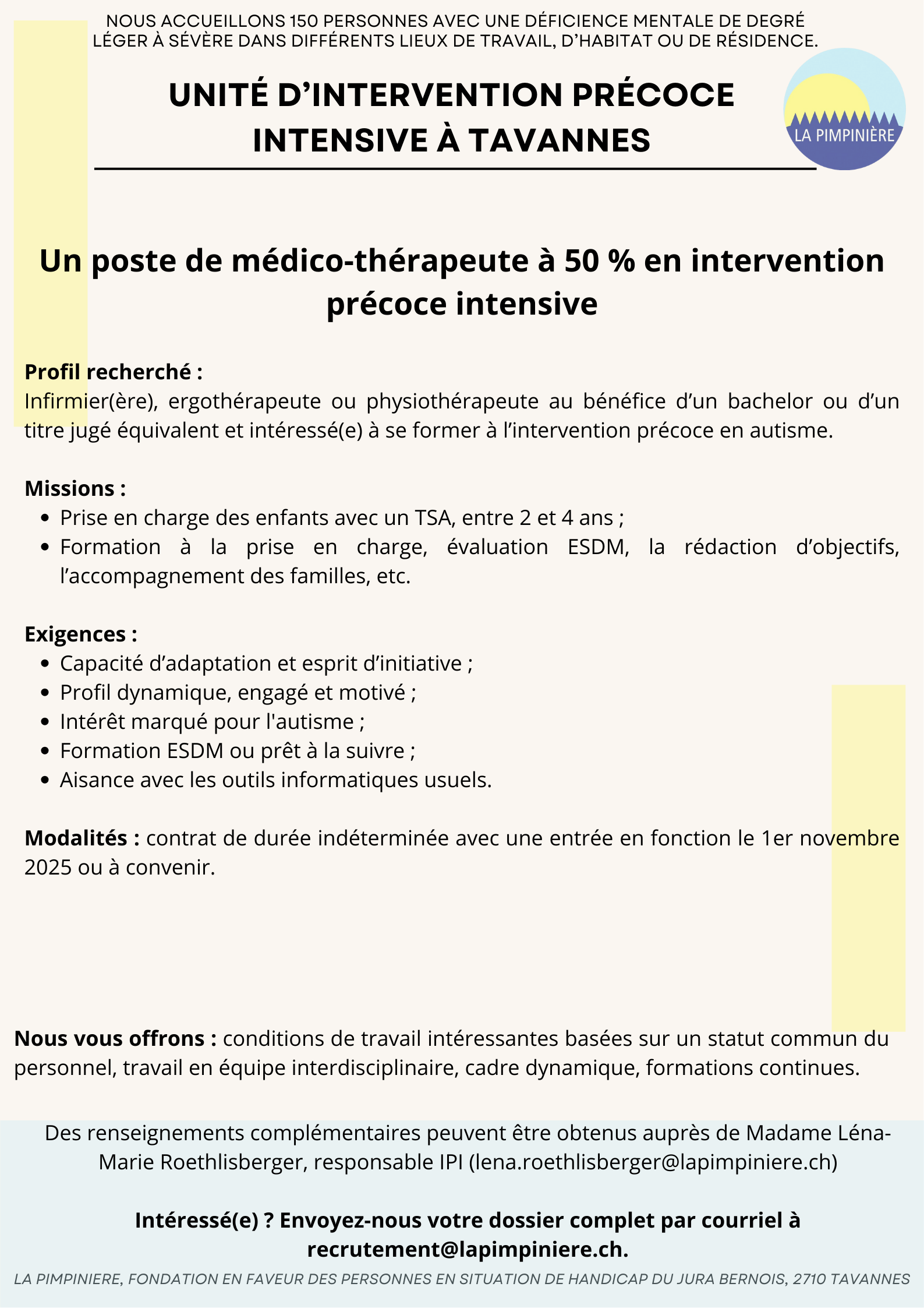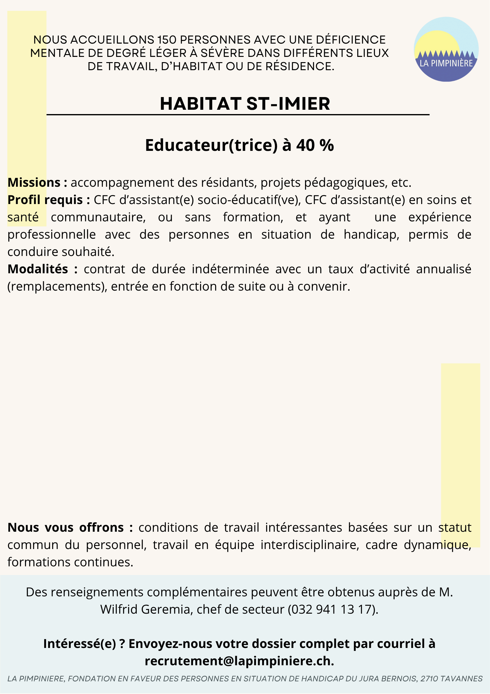 Les personnes intéressées sont priées de nous faire parvenir leur dossier de candidature complet par courriel à recrutement@lapimpiniere.ch
